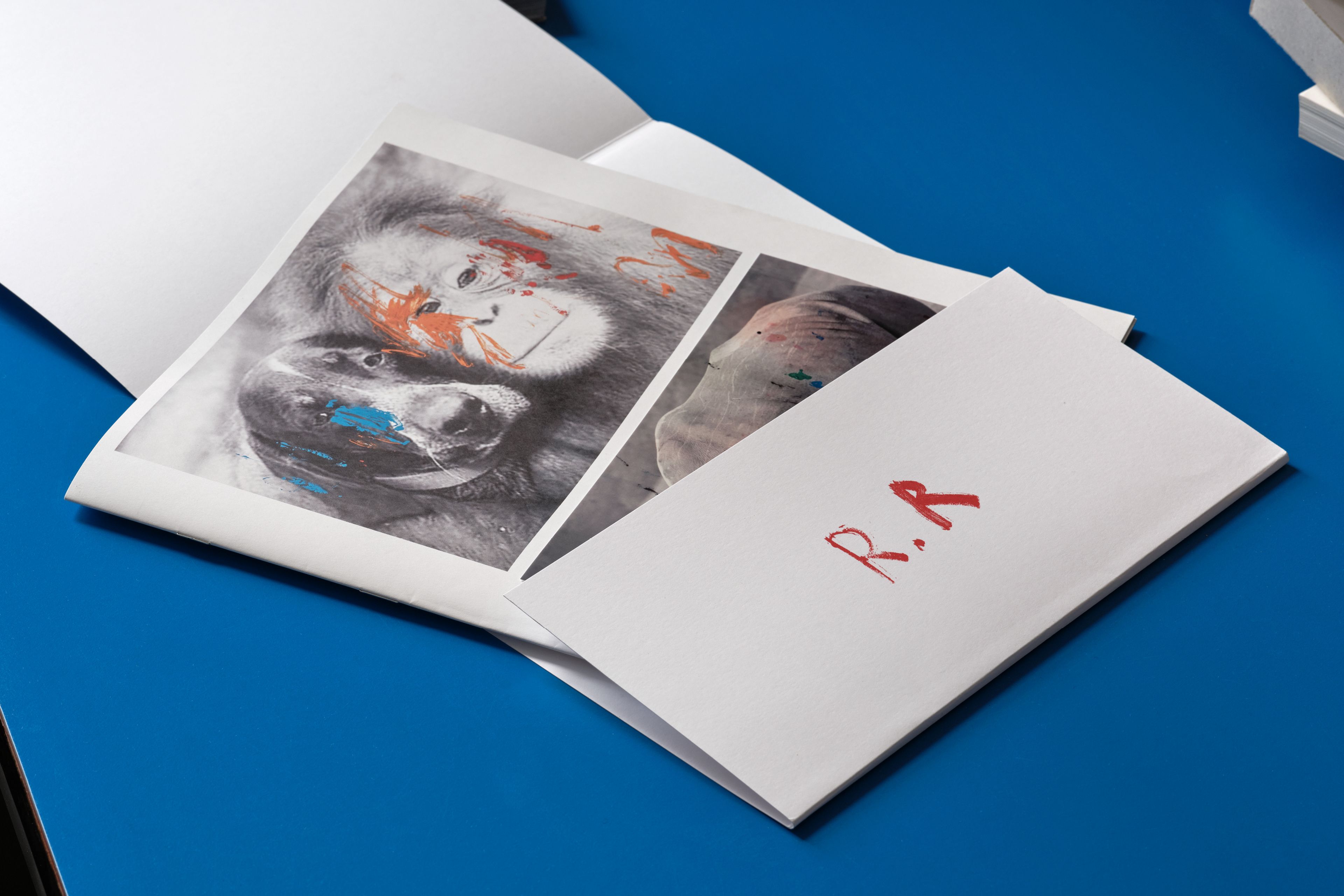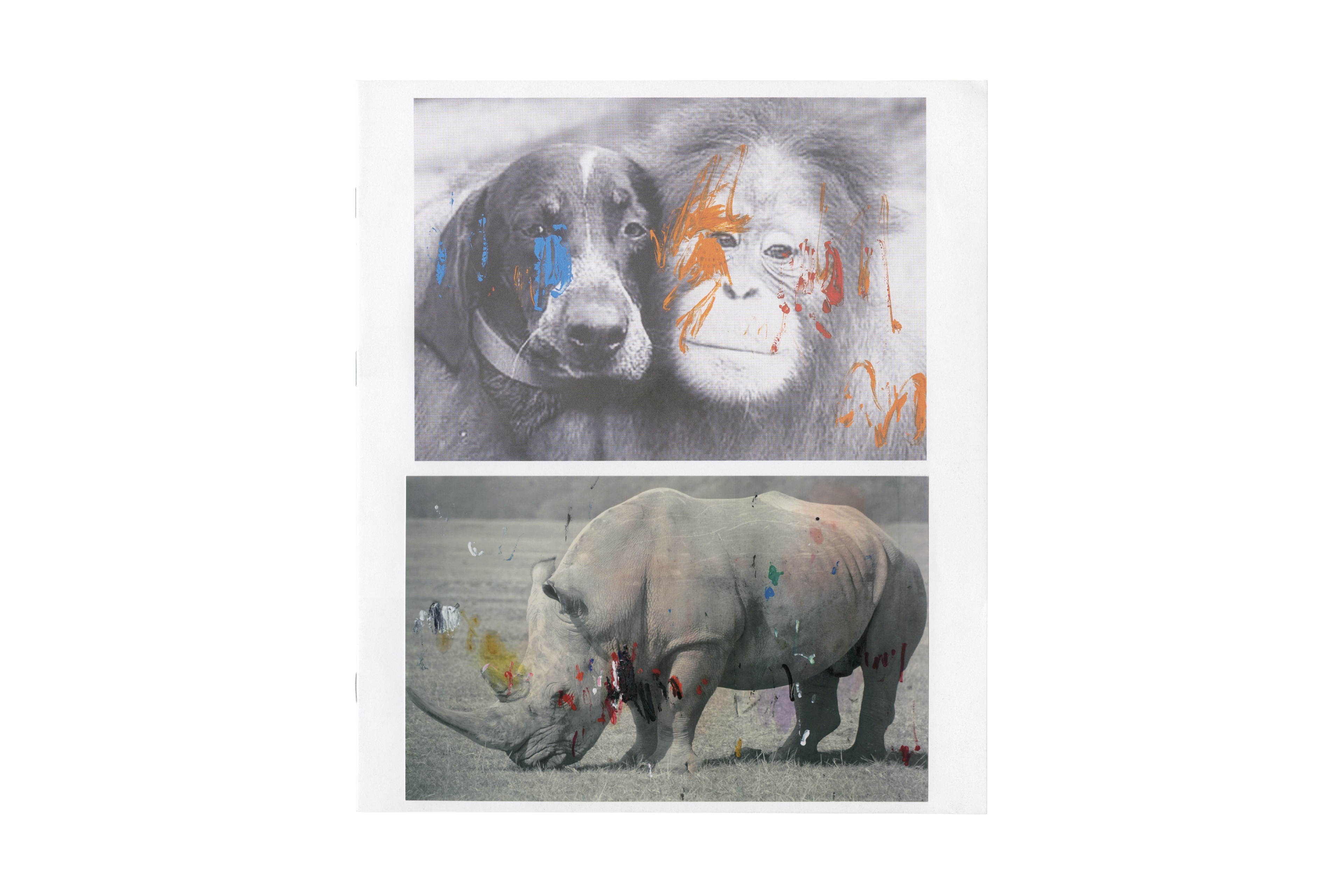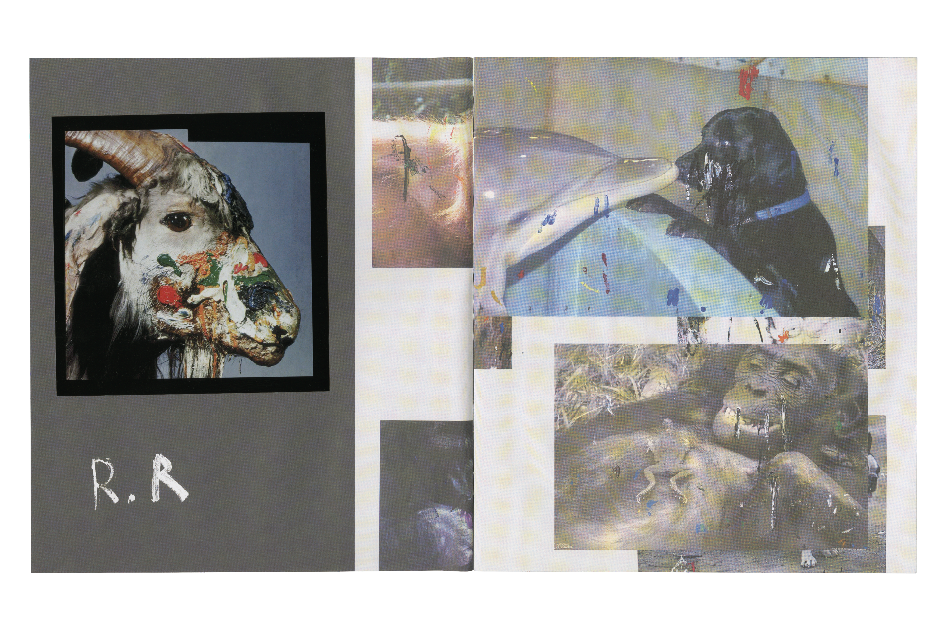 Henrik Olesen’s ‘R.R.’ originates in his reading of Donna Haraway’s ‘The Companion Species Manifesto.’ Through her, Olesen reimagines Robert Rauschenberg’s ‘Monogram’ using found images of interspecies attachments overlaid with painterly gestures that are both childish and fevered.