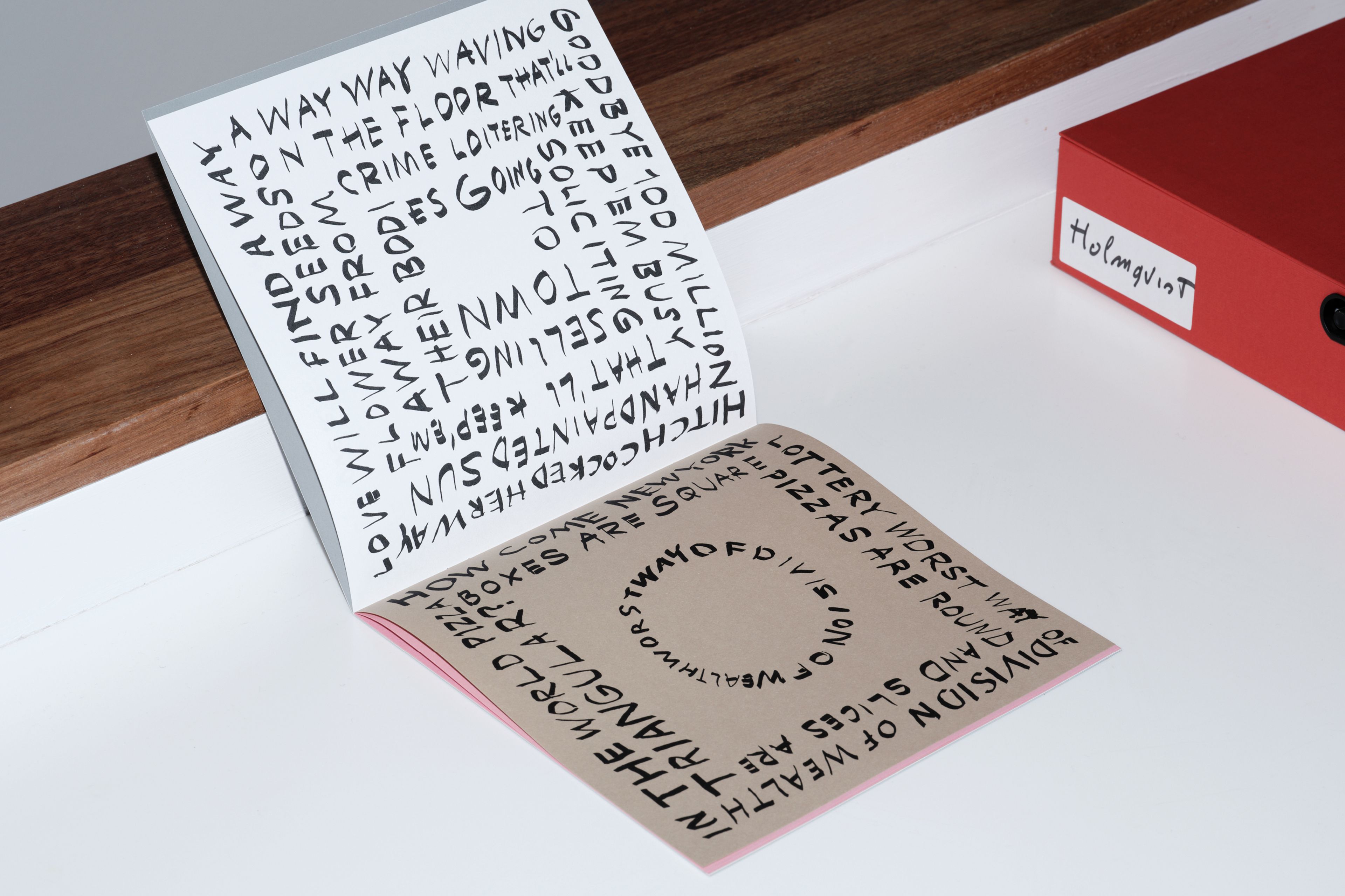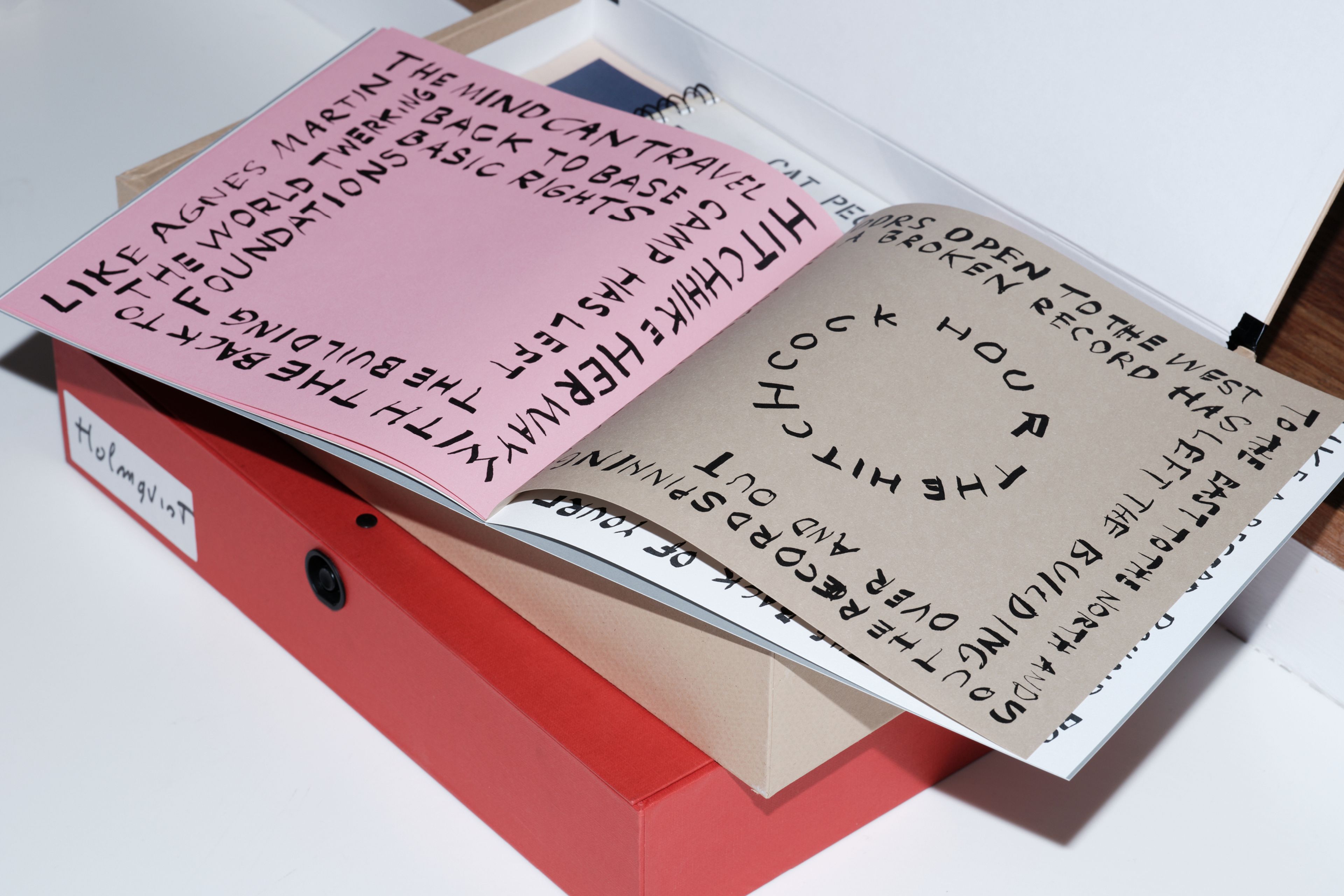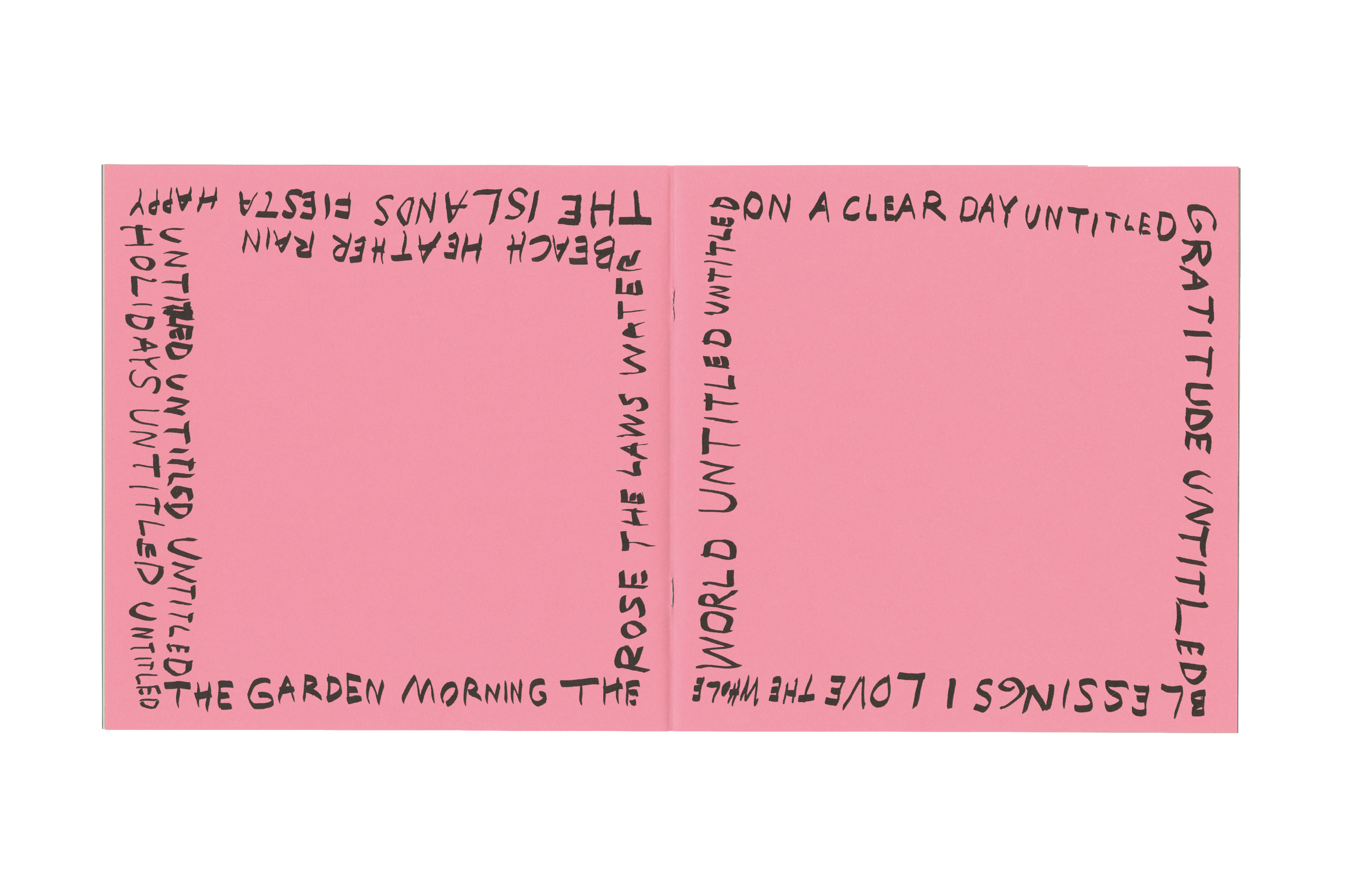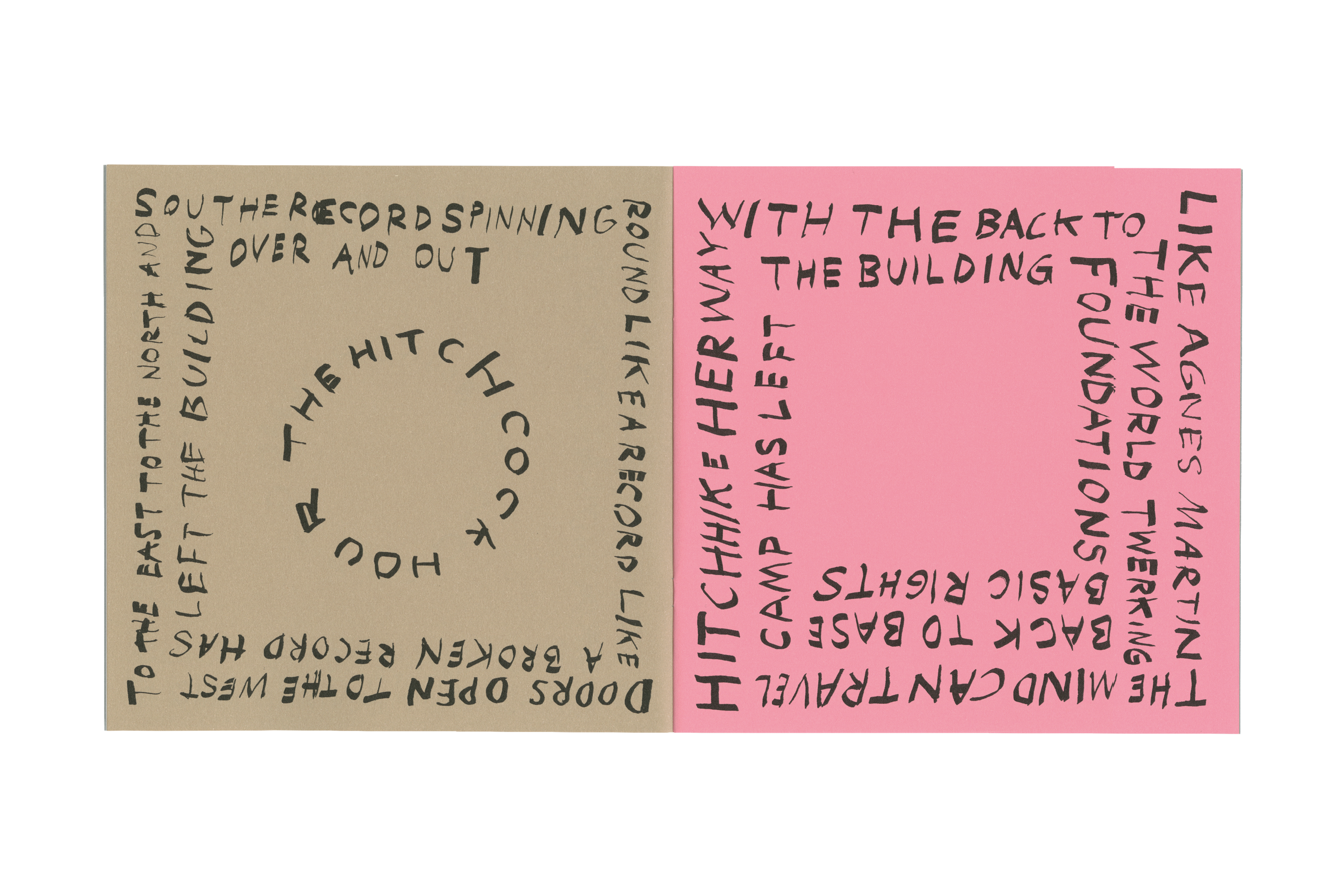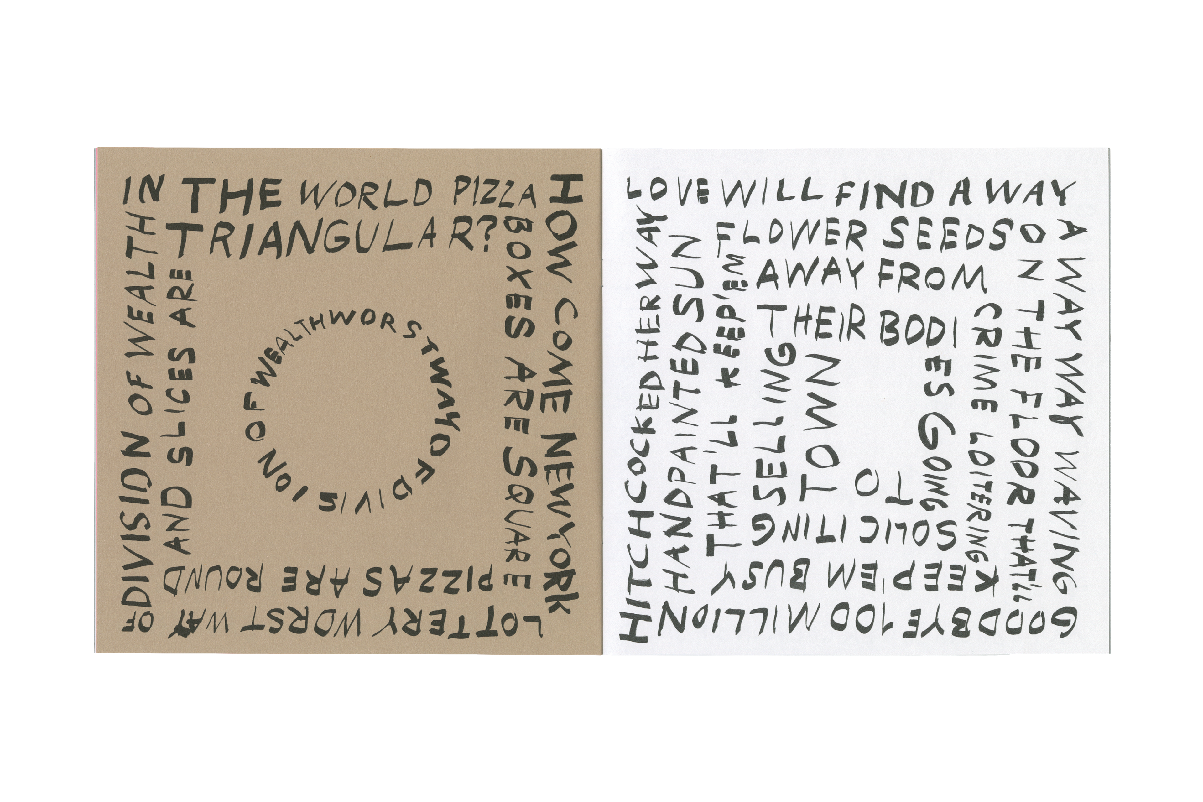 The square format in fact is taken from the preferred canvas shape used by American painter Agnes Martin, neither landscape nor portrait it allows for a kind of discovery and a figuring out along the way. Printed on different coloured papers and with some of the writing forming mid-centered circles the book also mimicks the shape of a record sleeve. While the reader spins the book like a record they can also recognise some of the phrases that might be spinning at the back of their minds.