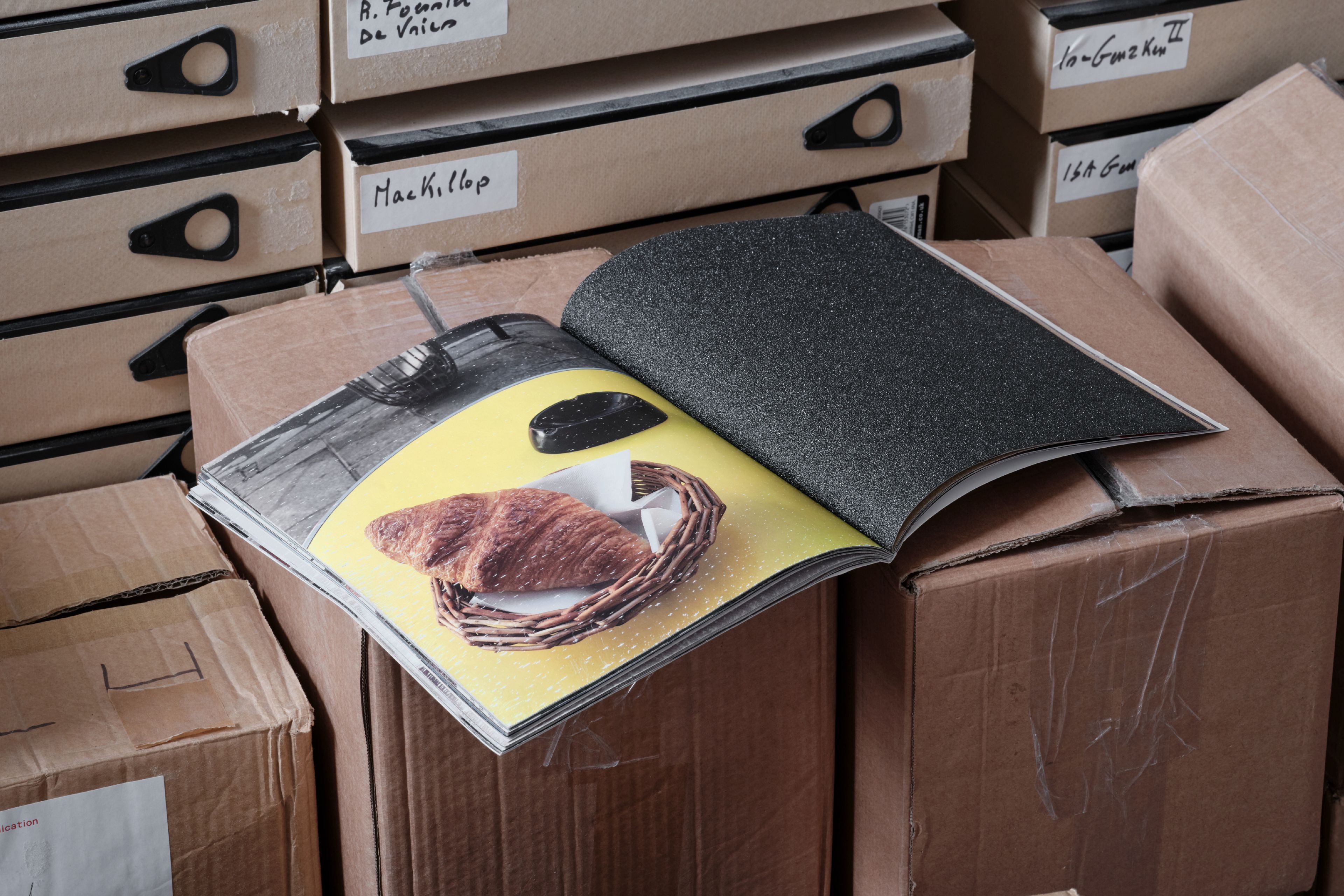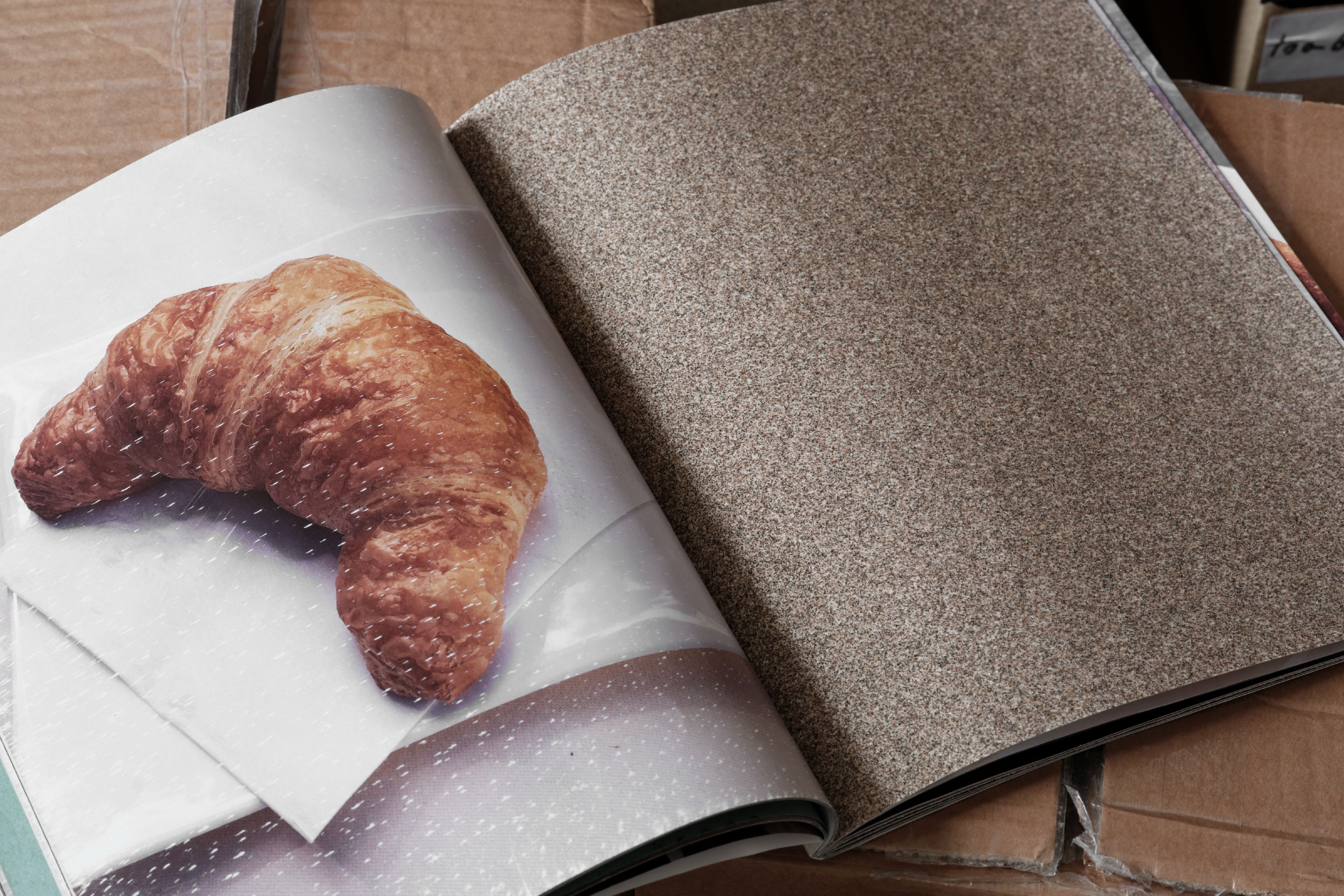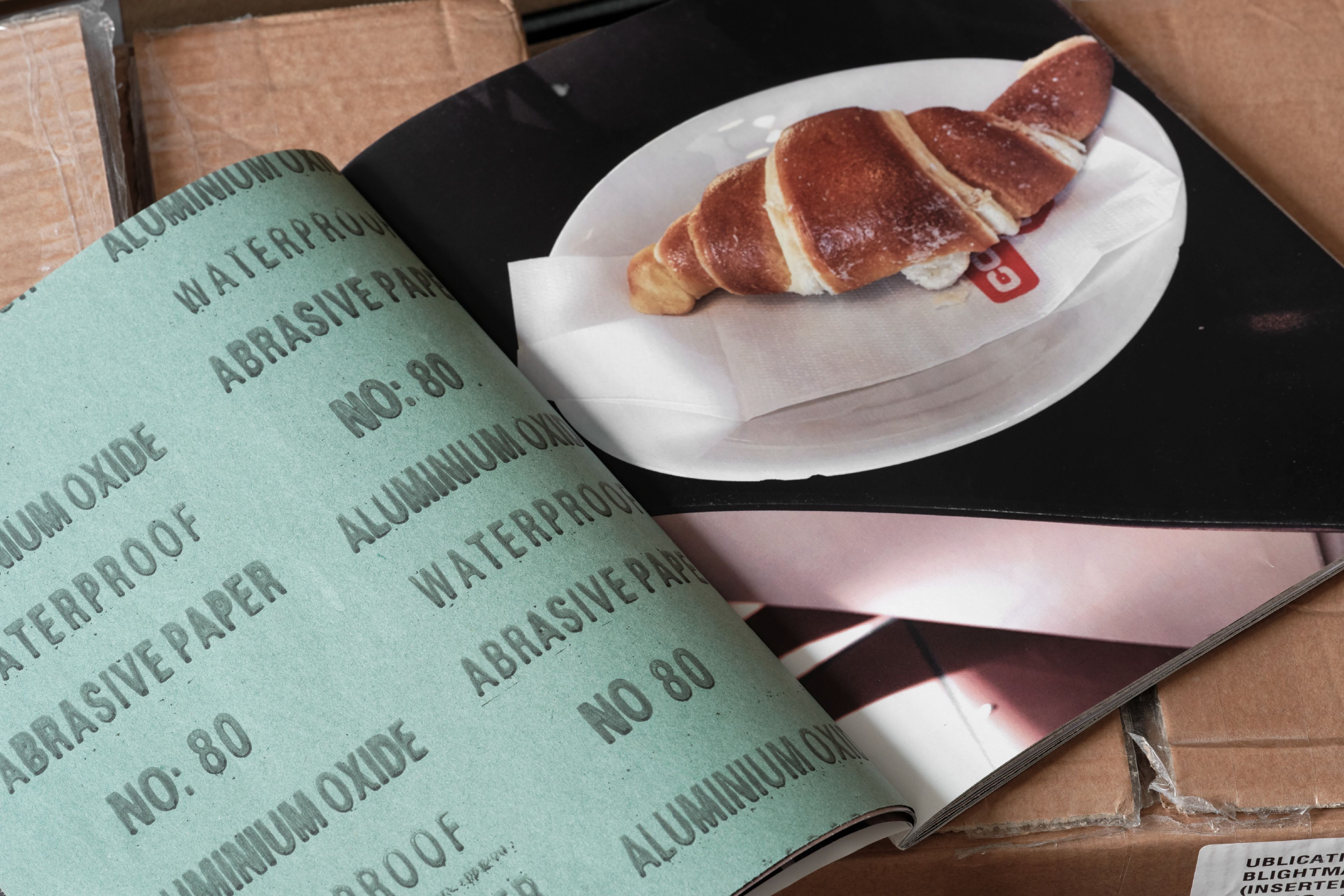 In ‘Croissants & Architecture’, the rough, working class texture of sandpaper scrapes against the flakey affluence of croissants. Composed of actual sheet of industrially manufactured sandpaper paired with photographs of croissants in public spaces this publication allows the sandpaper to slowly flake away the croissants.