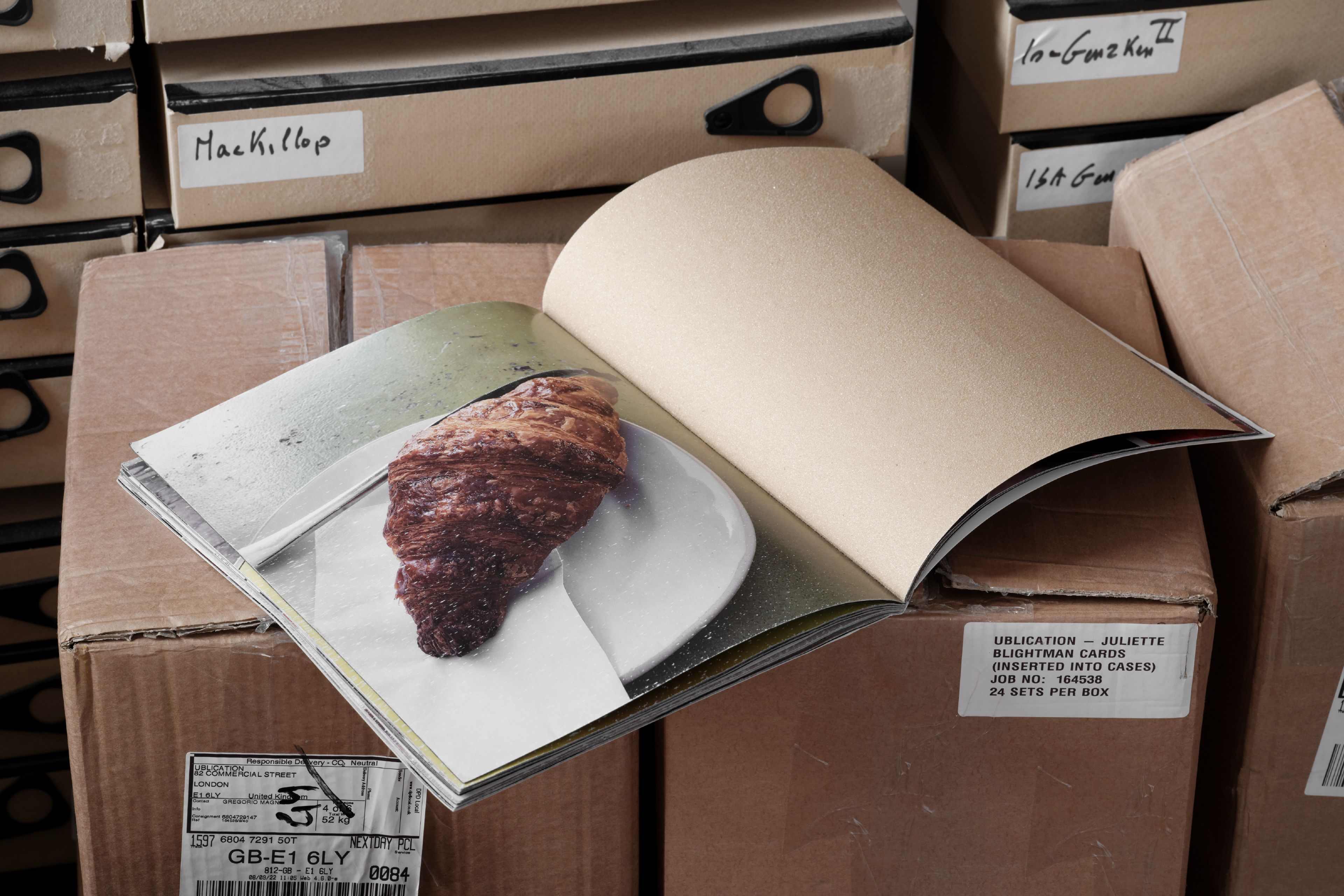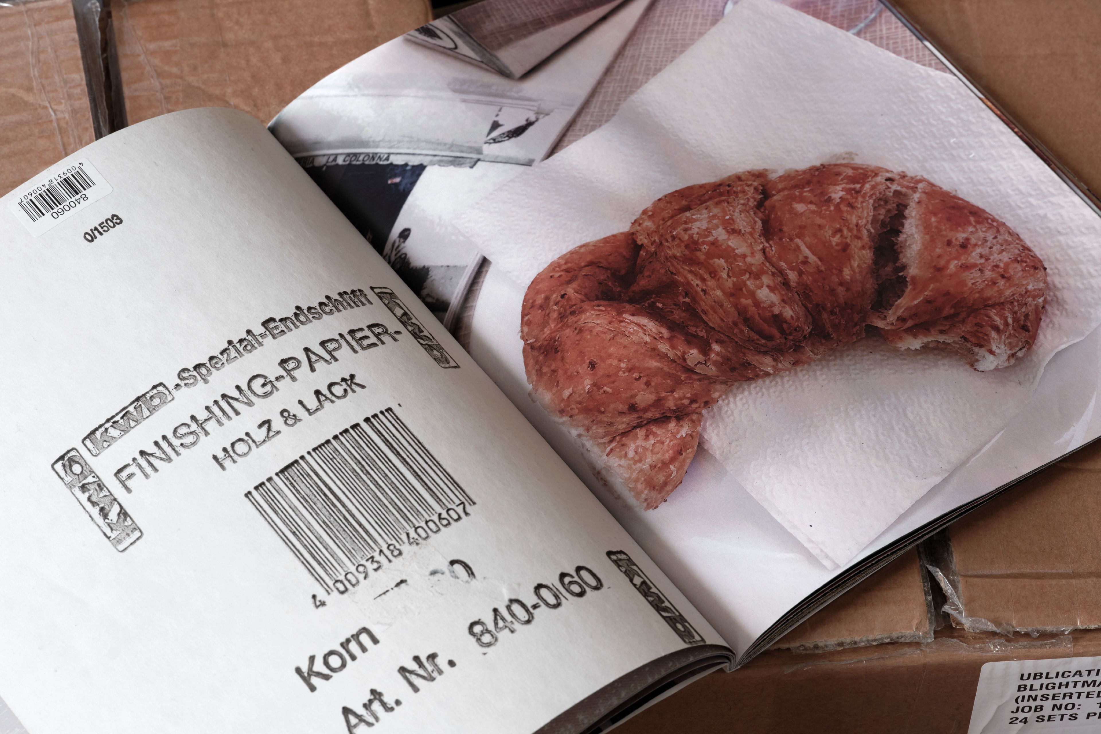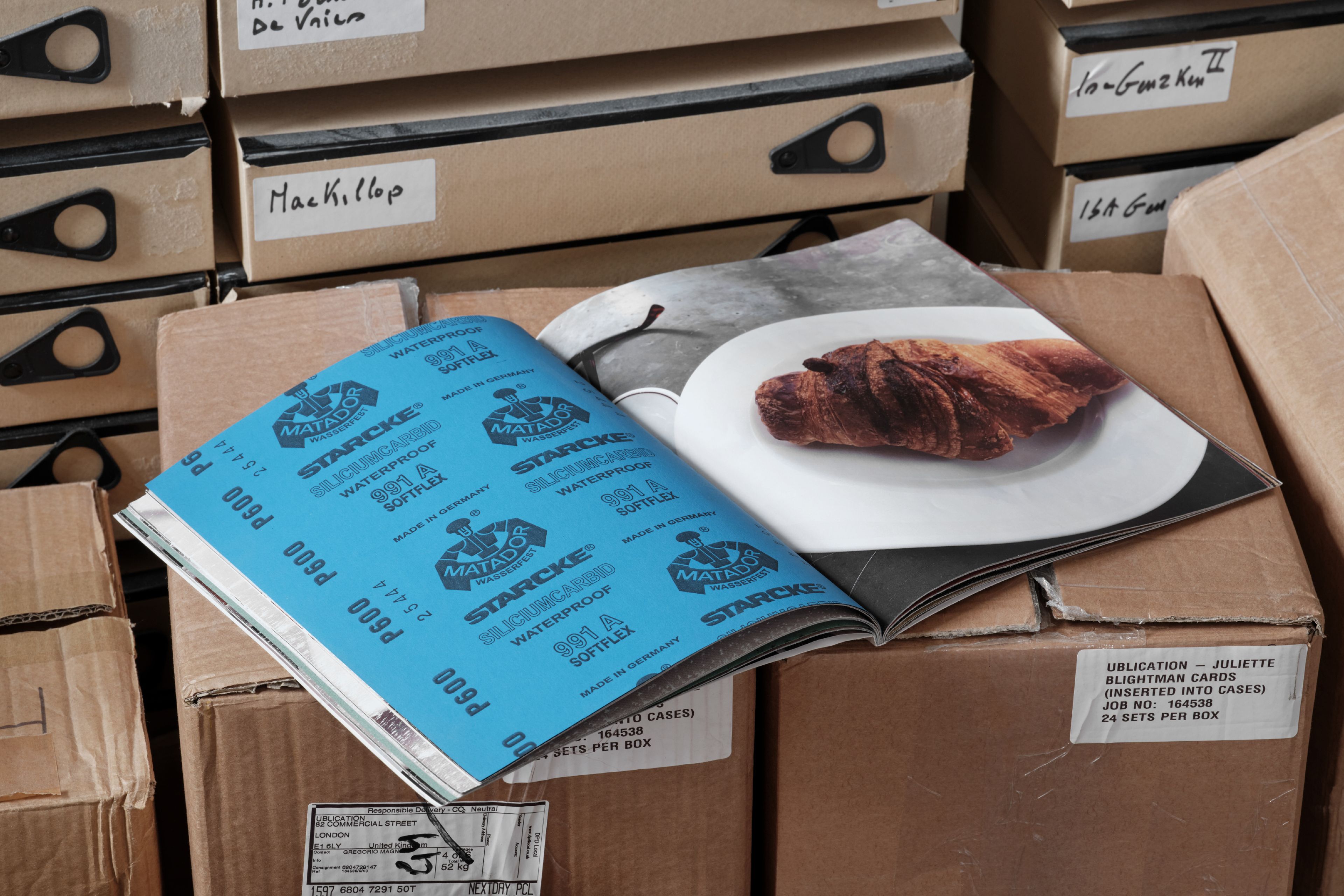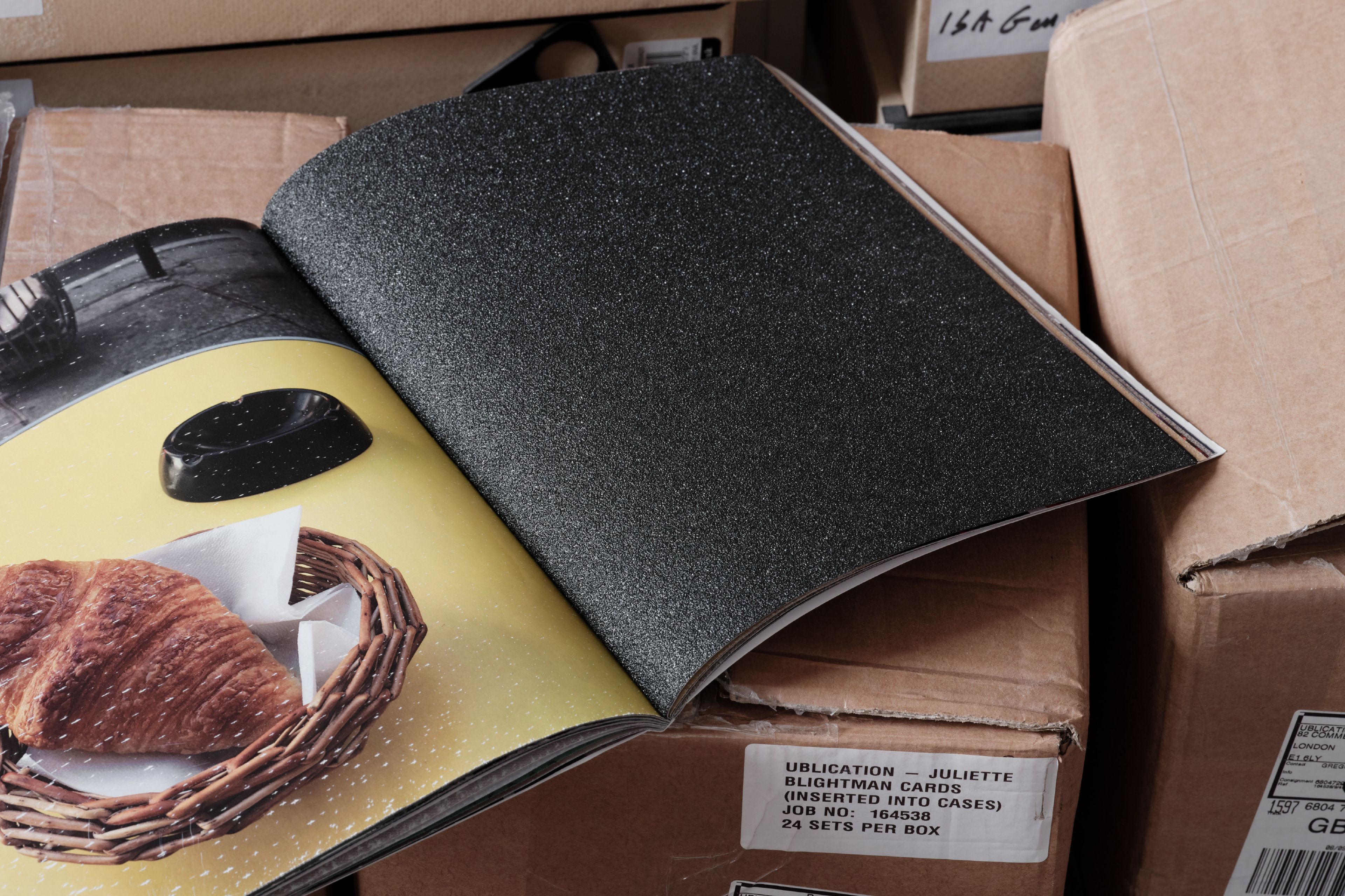 In ‘Croissants & Architecture’, the rough, working class texture of sandpaper scrapes against the flakey affluence of croissants. Composed of actual sheet of industrially manufactured sandpaper paired with photographs of croissants in public spaces this publication allows the sandpaper to slowly flake away the croissants.